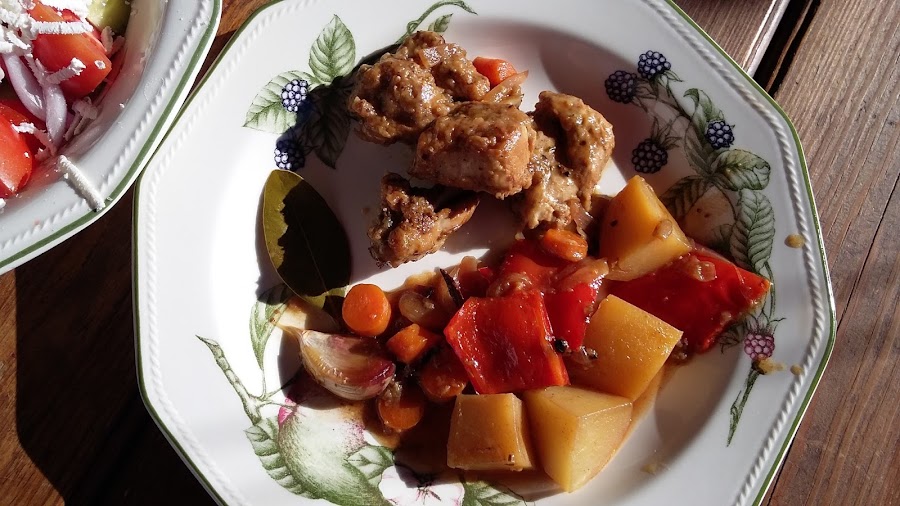 7- En una cazuela introducimos las verduras sofritas, incorporamos el conejo cubrimos con agua y dejamos hervir unos 30 minutos o hasta que la carne queda tierna.