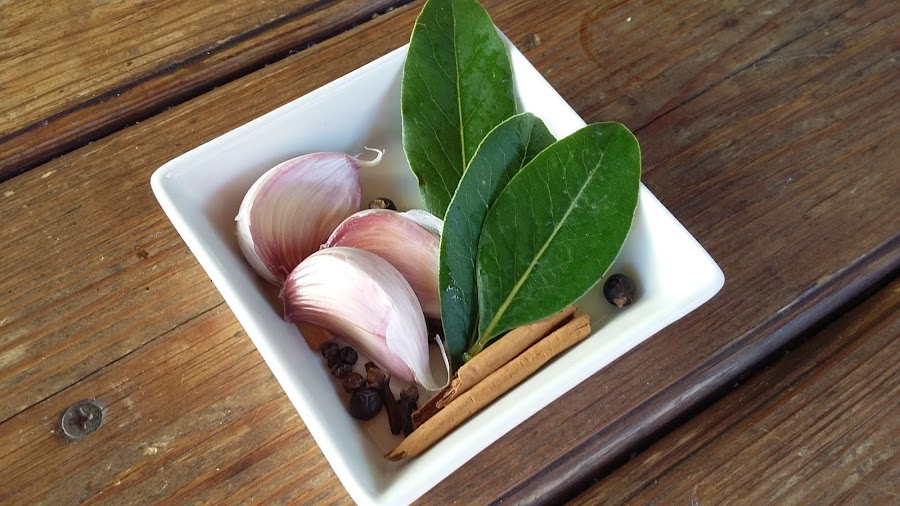 2- En un mortero, picamos todas las especias más un diente de ajo, añadimos aceite de oliva.