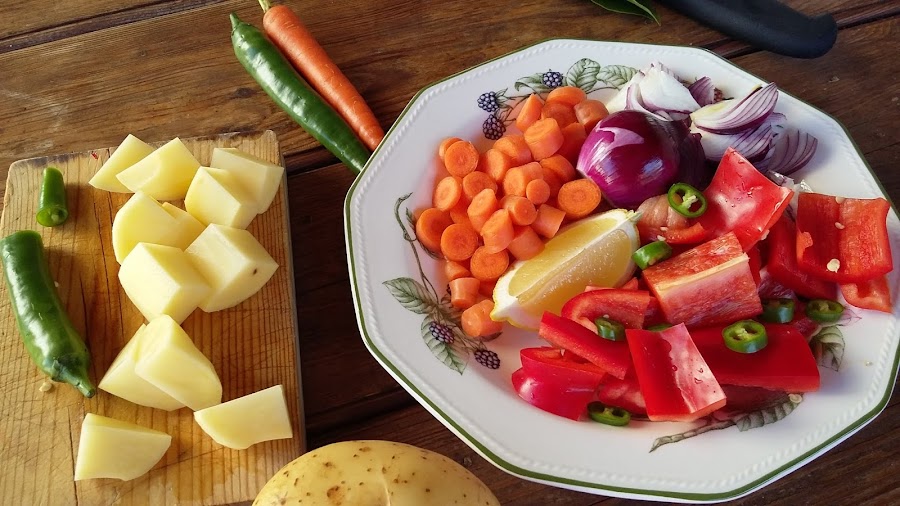 4- Cortamos la cebolla, el pimiento, la patata y las zanahorias en rodajas, laminamos los ajos.