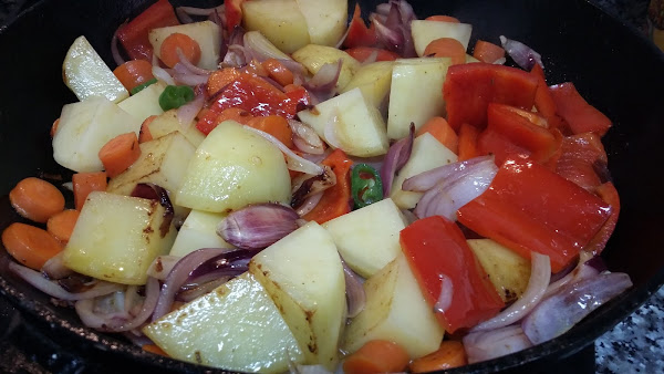 6- En la misma sartén freímos los ajos, la cebolla y resto de las verduras sazone con sal y vierte el vinagre, bajamos el fuego y dejamos que reduzca.