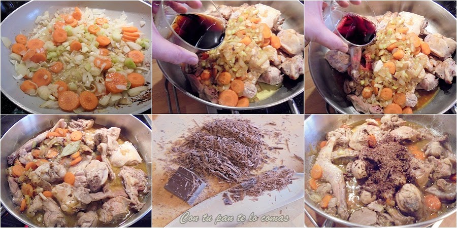 4. Mientras se hace el conejo, rallamos el chocolate y cuando el conejo casi esté hecho, lo añadimos a la cazuela y lo dejamos cinco o diez minutos, no más, removiendo bien para que se integre con la salsa.