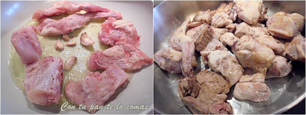 1. Dora el conejo en una sartén con unos ajos sin pelar (luego los retiramos). Previamente lo habrás sazonado con sal y pimienta negra. Según se vaya haciendo lo iremos colocando en otra cazuela.