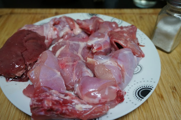 Salamos los trozos de conejo, si os gusta el hígado lo dejamos dorar y lo sacamos para hacer la picada.