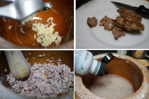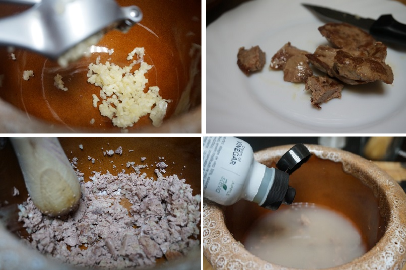 Mientras se dora el conejo, en un mortero preparamos la picada. Picamos unos cuantos dientes de ajos, 5-6 dientes, sacamos el hígado si está cocinado lo cortamos en trozos y lo añadimos al mortero junto a los ajos lo machacamos todo bien, añadimos un vaso de agua y un buen chorro de la crema de vinagre de manzana, 6-7 cucharadas soperas, si os gusta más fuerte añadir más. Lo mezclamos bien.