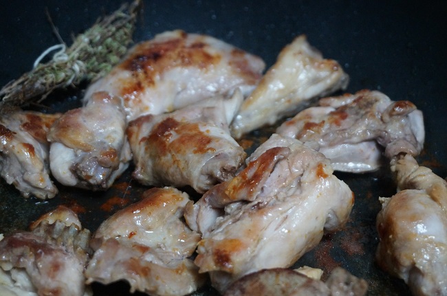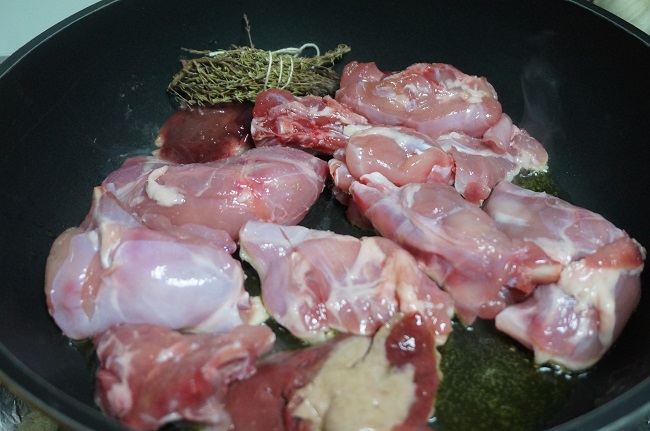 Ponemos una cazuela con un buen chorro de aceite, añadimos los trozos de conejo, el hígado, el ramillete de hierbas y lo doramos a fuego fuerte.