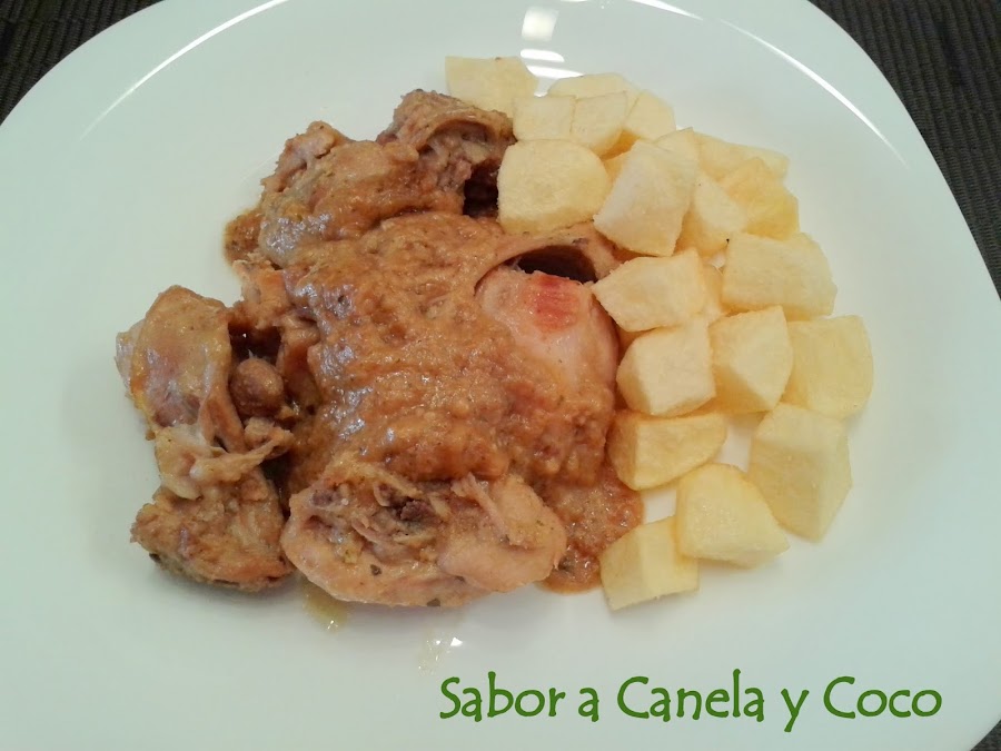 Vertemos este majado en la cazuela o olla y añadimos una cucharadita de harina y damos unas vueltas, añadimos el conejo y puse menú carne 15 min, en la cazuela un poquito mas que haga chup chup. Acompañamos con unas patatas fritas y a disfrutar!!!!!!!!!!!!!!!!!!!