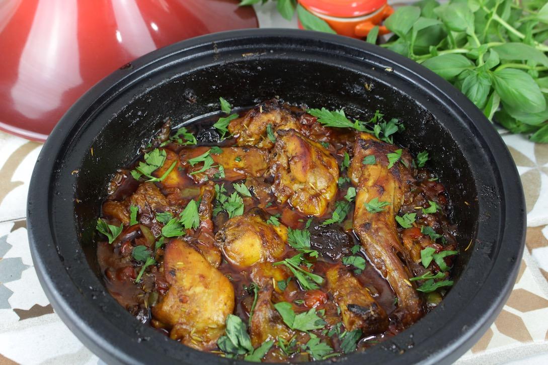 Asado de conejo en tajine con verduras y especias marroquíes.