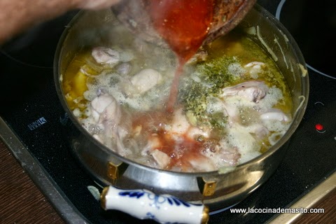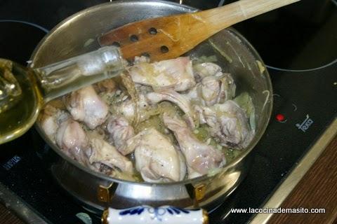 Turno ahora de agregar el vino, fijaros en el color del conejo, no esta dorado, solo marcado un poco, pues eso, echar el vino y ponerlo a fuego alto hasta que rompa a hervir, luego lo bajais y lo dejais a fuego medio