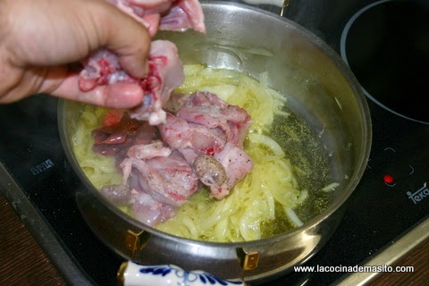 Y cuando la cebolla ya este transparente y bien pochada, lo vamos a introducir en la cazuela y lo vamos a marcar ligeramente, no hace falta que se dore, solo marcarlo un poco para quitarle el color natural y sellar la sangre.