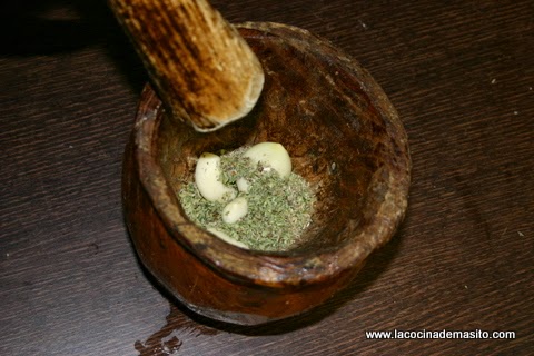 A continuación y en un mortero vamos meter los cinco dientes de ajo ya pelados, y las dos cucharaditas de especias, la de tomillo y l de orégano, lo machacamos todo bien