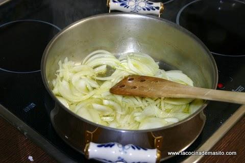 Lo primero que vamos a hacer es poner aceite en una cazuela, cortar la cebolla en juliana y ponerla a pochar a fuego medio alto, removiendo de vez en cuando para que no se nos queme, que si no la cebolla quemada amarga, si veis que el fuego esta muy alto, no pasa nada, lo bajáis un poco y listo.