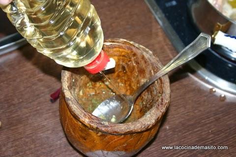 En el mortero donde machacamos los ajos echamos el vinagre, así conseguiremos que los restos que hubieran quedado del machacado se limpien y añadan también al guiso