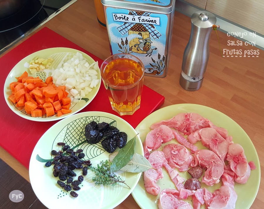 1 bandeja de lomos de conejo, 1 cebolla, 2 zanahorias, 2 dientes de ajo, 9 ciruelas pasas, 1 puñado de uvas pasas,2 vasos de vino fino, harina, agua, AOVE, sal, pimienta negra, 2 hojas de laurel, tomillo.