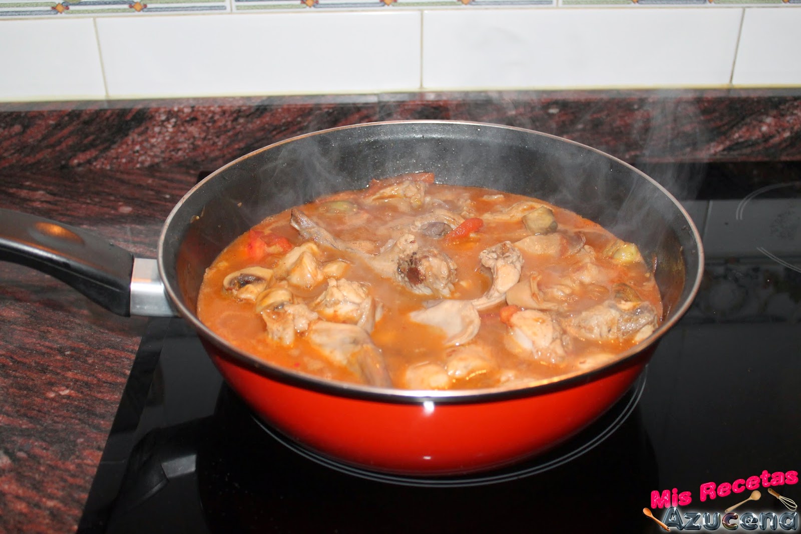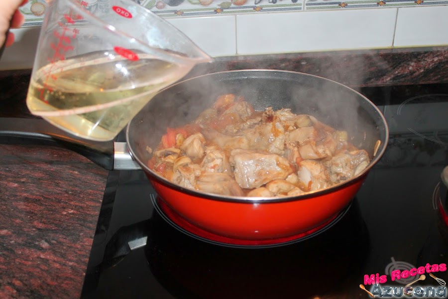 Por ultimo añadiremos el vino y el agua, removemos todo bien, bajamos el fuego a fuego bajo y lo dejamos cocer durante 1 hora y 15 minutos.