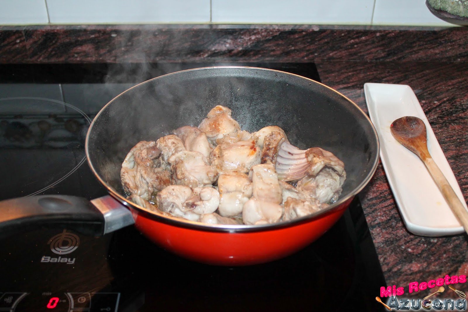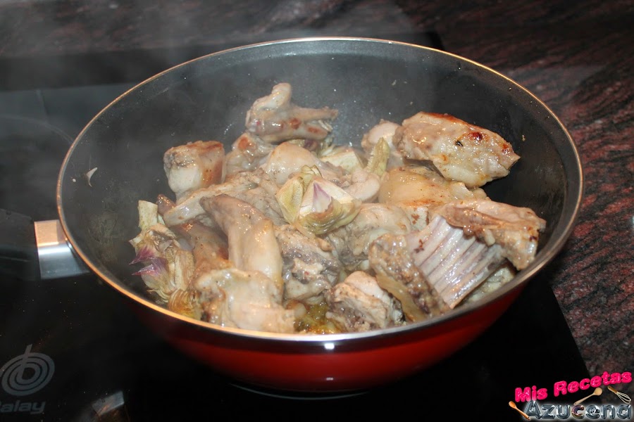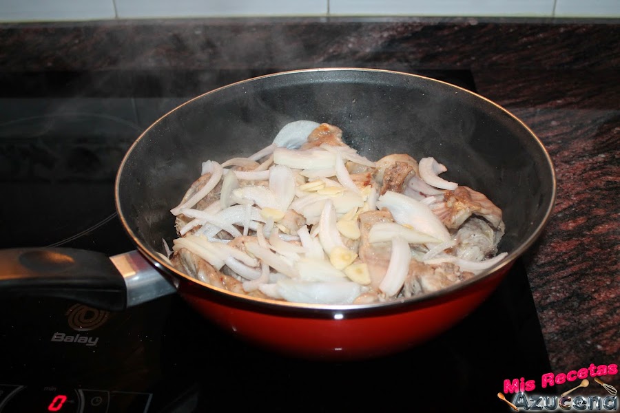 En el momento que el conejo empiece a dorarse añadiremos la cebolla y el ajo, removemos todo y lo dejamos sofreír durante 5 minutos más.