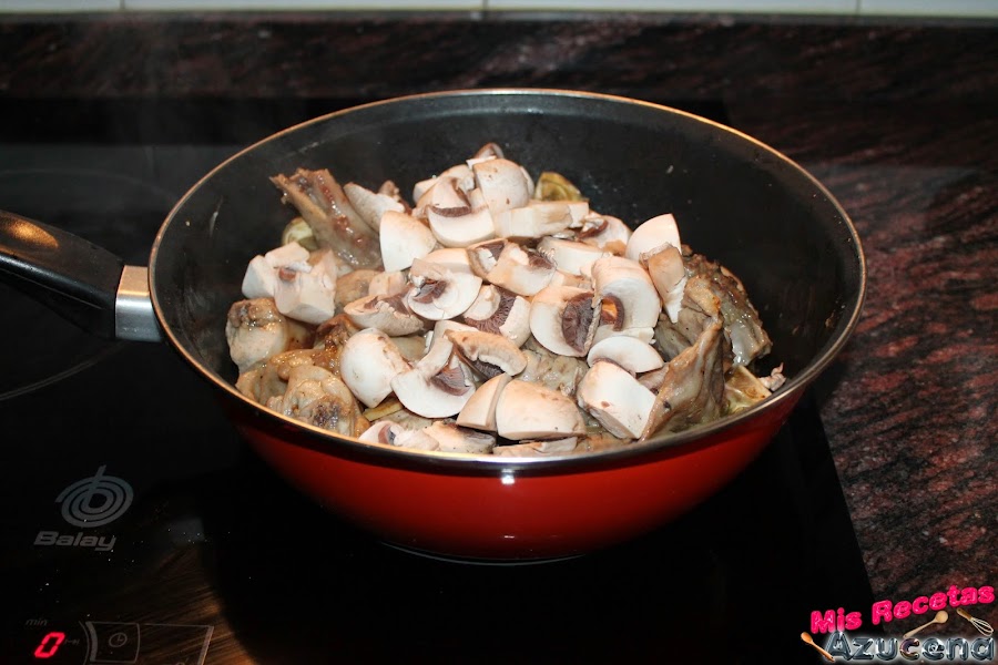 Pasados los 3 minutos por las alcachofas añadiremos los champiñones, removemos todo y dejamos sofreír durante 5 minutos más para poder añadir el tomate.