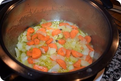 Cuela el aceite, ponlo en una cacerola a calentar de nuevo y sofríe la cebolla picada. Cuando esté transparente, agrega las zanahorias en rodajas.