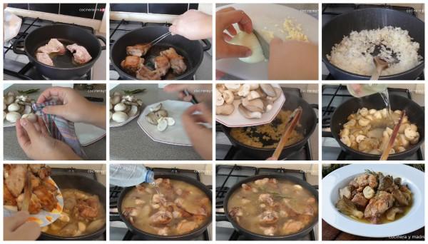 Si en ese transcurso el conejo guisado con setas se queda muy seco tenéis que añadirle un poco más de agua o caldo.