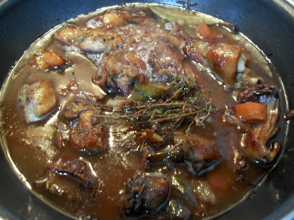 Agregar la marinada sobre la carne que quede completamente cubierta. Añadir más vino si hace falta y/o un poco de caldo de verdura. Tapar la cazuela y cocer a fuego bajo 1hora y 30 minutos.