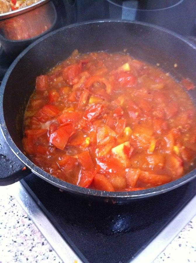 * Añadimos la sala de tomate que hemos antes agregar el laurel o tomillo, y tapar y dejar que se mezcle todos los sabores a fuego bajo unos 15 o 20 minutos .