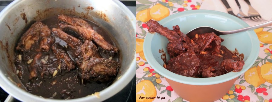 Se trata de conejo con una "salsa" especial, el Dolce forte, que también puede acompañar otros platos de carne y pescado. En su preparación original esta receta incorpora chocolate, cabello de ángel y azúcar entre otros ingredientes, de ahí el origen de su nombre (dulce fuerte). En la práctica, como siempre, puede variarse, reducir o eliminar algún ingrediente según gustos y disponibilidad. En una ocasión la preparamos sin cabello de ángel ni azúcar y el resultado fue perfecto, nos encanta el punto del chocolate, así que no hay excusa para no probar.