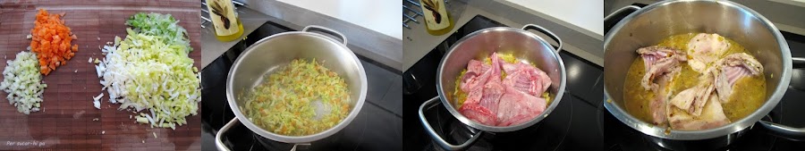 En una cazuela al fuego colocar 4-5 cucharadas de aceite de oliva y calentar. Sofreír las verduras ligeramente y añadir el conejo, dándole la vuelta para que se dore por todos lados.