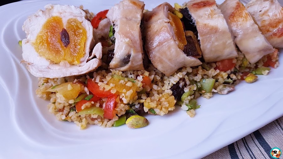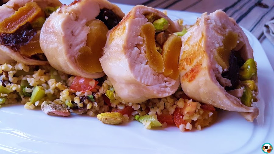 En casa acompañe el plato con una guarnición de bulgur con unas habichuelas, algunos frutos que me sobraron y unos tomates pequeños.