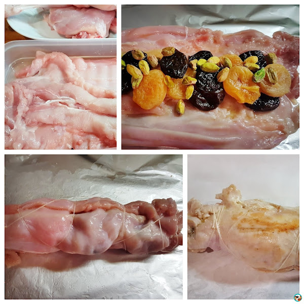 2.-Salpimentamos el conejo, lo ponemos abierto sobre una placa cubierta con papel de horno, con la parte inferior boca arriba. Disponeos los frut@s secos bien escurridos sobre la carne de conejo. Enrollamos el conejo sobre si mismo y lo atamos con un hilo de cocina.