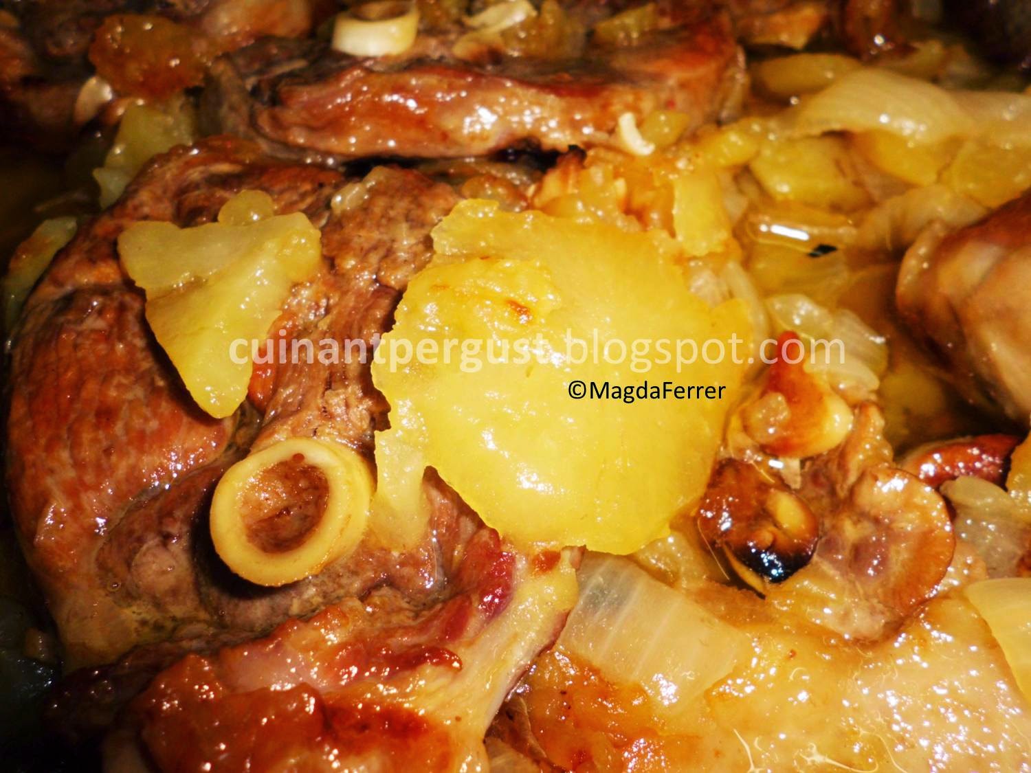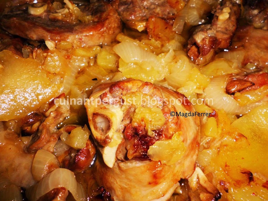 Transcurrido ese tiempo dar la vuelta al cordero y remover las patatas y la cebolla para que no se quemen, regar con el aceite e introducir de nuevo en el horno a 90ºC durante una hora más. Servir.