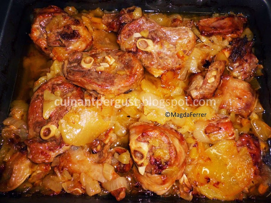 Poner un chorro de aceite de oliva en una fuente apta para horno, encima las patatas y otro chorro de aceite. Seguidamente la cebolla y el ajo, otro chorro de aceite y finalizar disponiendo el cordero sobre las verduras, regado con el zumo de limón y un chorro generoso de aceite. Introducir la fuente en el horno, precalentado a 100ºC, altura media y calor sólo abajo, a 90ºC durante una hora.