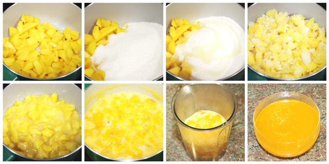 Pelamos el mango y lo partimos en trocitos pequeños, añadimos el azúcar y el zumo de limón en una cacerola pequeña.