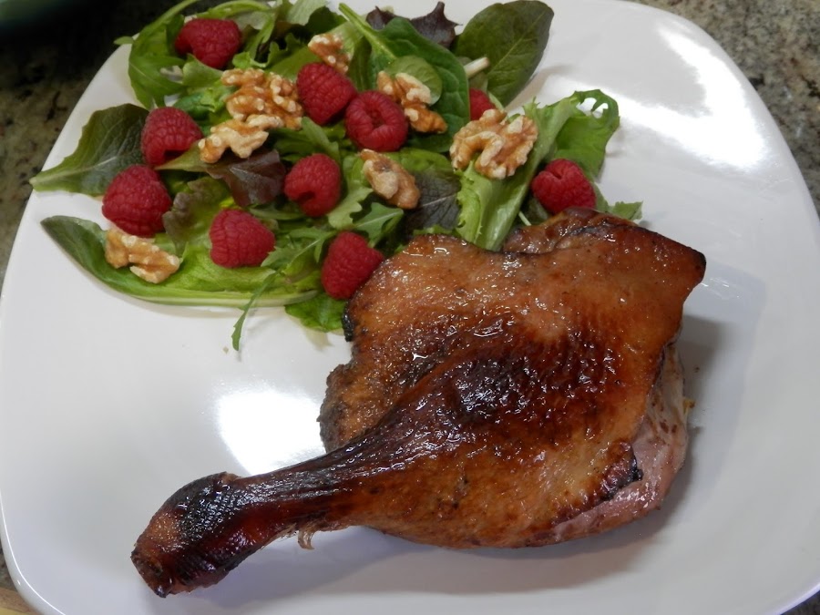 Regamos el confit con la salsa y a continuación, agregamos un poco de salsa encima de la ensalada.
