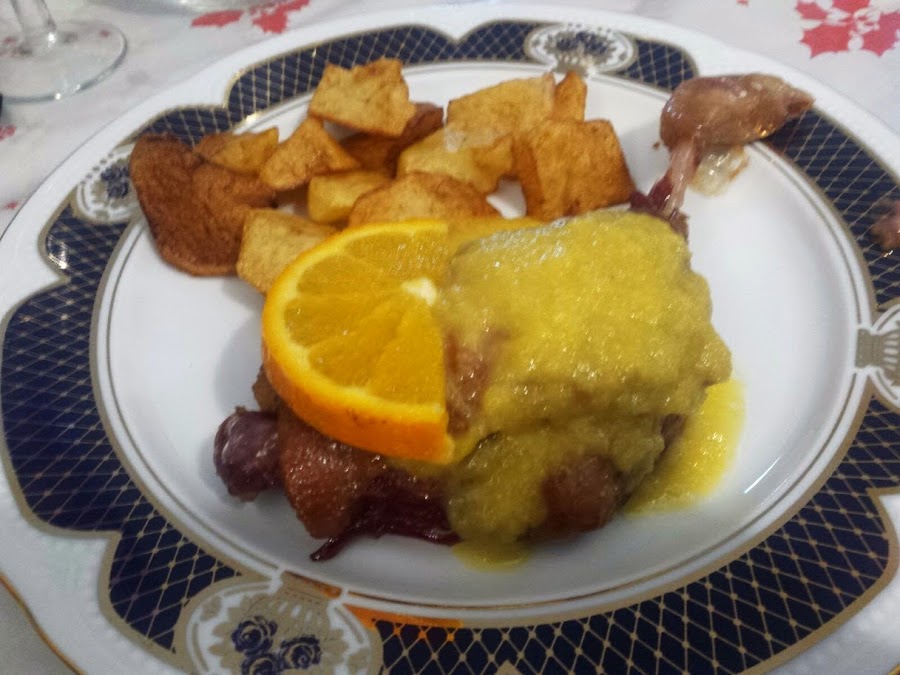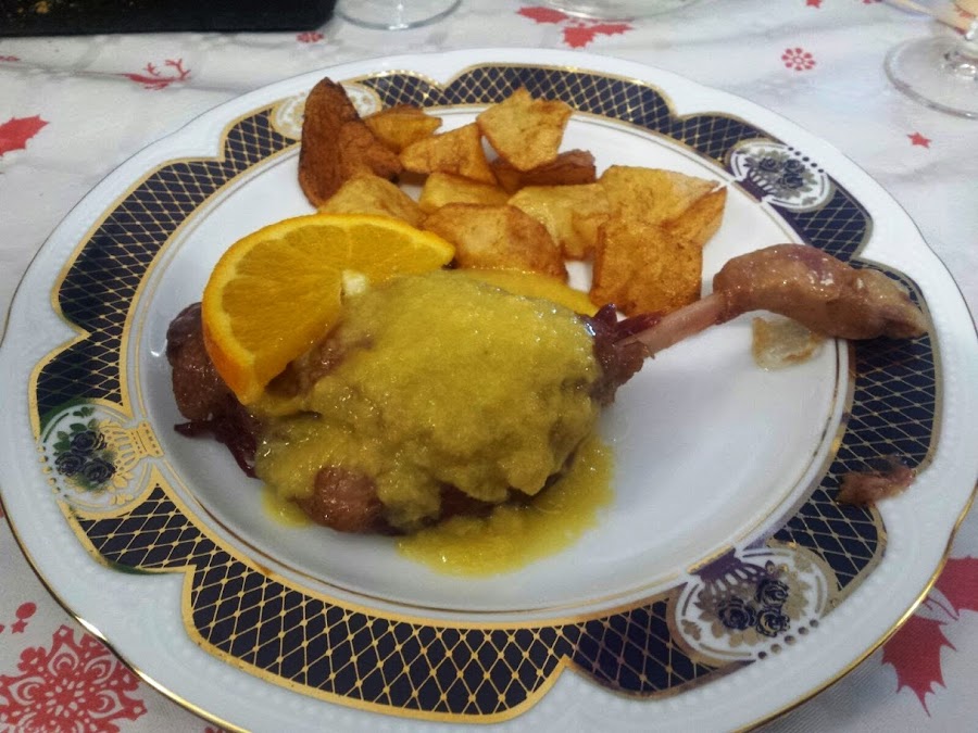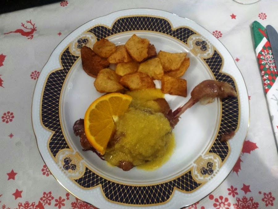 Poner un confit caliente en el plato, servir con un poco de la salsa por encima del confit, media rodaja de naranja para adornar y acompañar de las patatas fritas.