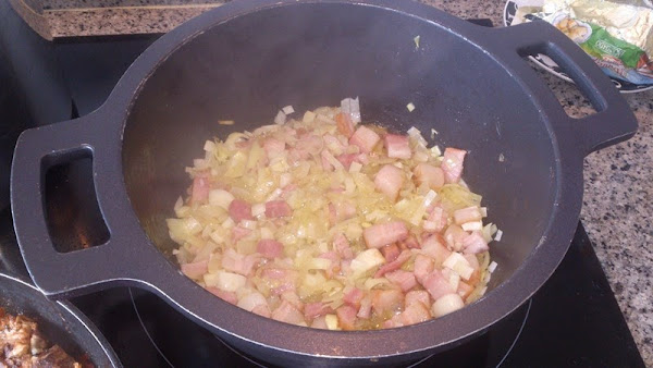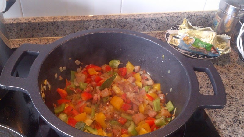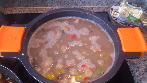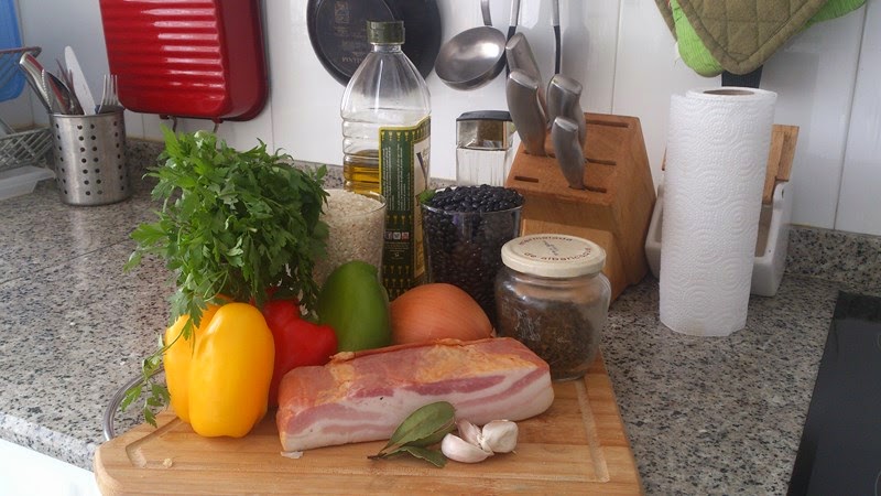Aceite de oliva virgen o el que uses La noche antes ponemos a remojo los frijoles, al día siguiente cambiamos el agua y ponemos a cocer 12 mnts. en la olla expres, mientras cortamos la cebolla y el ajo, lavamos y cortamos los pimientos, el bacon y el perejil; cocidos los frijoles apagamos la fuente de calor y dejamos que la olla libere la presión, ponemos a calentar el recipiente donde vamos a cocinar el arroz con un chorro de aceite, yo uso siempre para el arroz una olla de aluminio fundido de mucho grosor para que no se queme, ponemos el ajo y la cebolla picados a dorar sin que se queme, agregamos los trocitos de bacon.