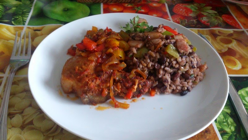 Para acompañar se suele poner una carne de cerdo, sea costillas, jamón o chuletas cocinadas jugosas con tomate natural, cebolla, y pimiento, albóndigas, e incluso pescado guisado, ensalada fresca con aguacate etc., a gusto del consumidor. Servimos y disfrutamos.