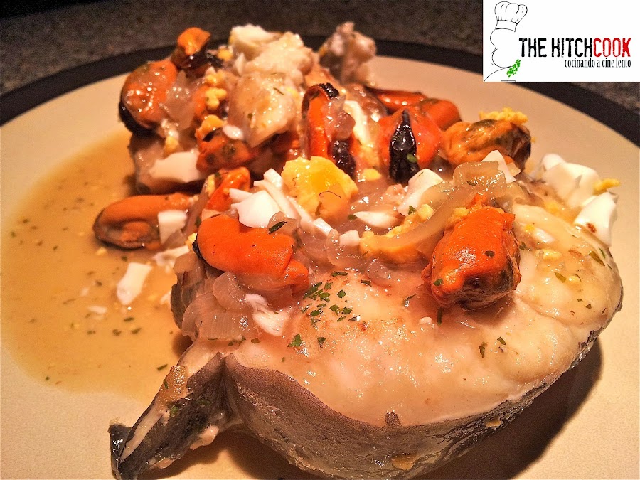 El dominio total y absoluto de elementos marinos de la receta, invitaba a mi alocada imaginación a hundirse en la cinematografía oceánica. Hay infinidad de ejemplos que dignificarían este plato pero viendo la grandeza y contundencia de un congrio cerrado, su enorme protagonismo y el acecho al que es sometido por parte de los mejillones, la idea de una batalla en el agua se apoderó de mí hasta materializarse en la gran ballena blanca del cine, es decir, en MOBY DICK.