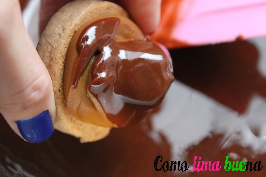 Bañar en chocolate los conitos. Primero cubrir la punta del dulce de leche y luego sumergir el cono por completo.