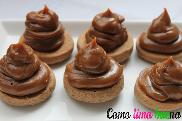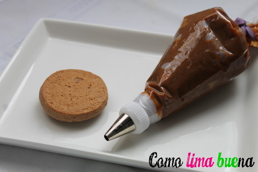 Rellenar una manga con boquilla redonda y realizar en cada tapita un copo de dulce de leche. Llevar las tapitas al freezer para que endurezca el dulce de leche.