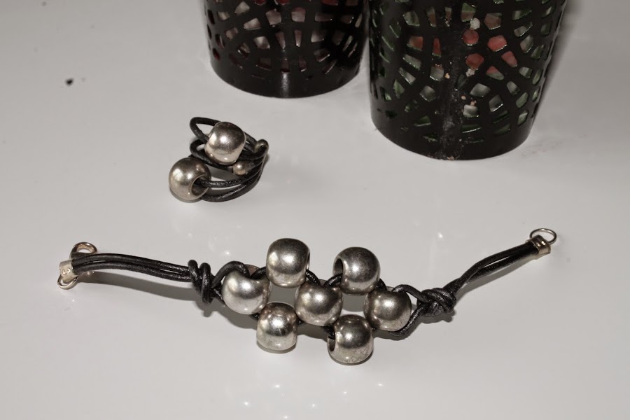 Se trata de un conjunto hecho en cuero gris con acabado metálico, en un tono bastante oscuro, que me encanta! Y he utilizado unas bolas de acero con el agujero muy ancho, para hacer unas "flores" para la pulsera, y en el caso del anillo, montadas sobre varias vueltas de cuero.