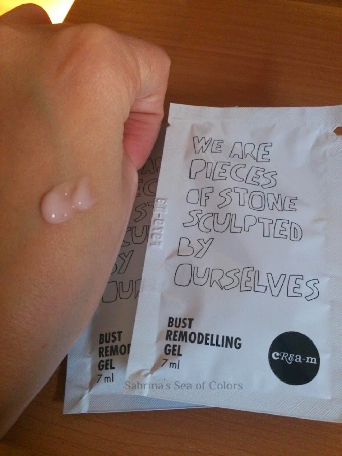Gel remodelador de busto. Es un gel fresco de color rosa. Promete aumentar volumen, tonificar y realzar el busto (cosa que habría que comprobar más a largo plazo). Además, rejuvenece el escote y evita la aparición de arrugas, hidratando la piel en profundidad. Se trabaja muy bien sobre la piel y se absorbe rápidamente. Hay cremas para la zona del pecho y escote que me irritan o me sacan granitos, con este gel no me ha pasado, así que muy contenta de momento.