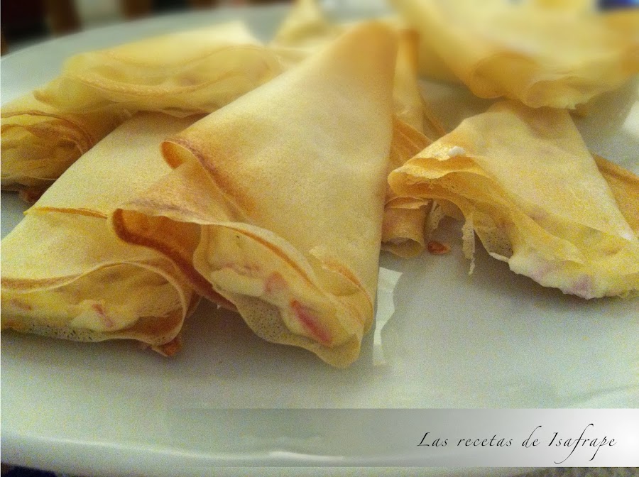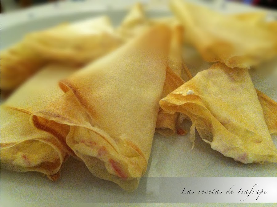 Precalentamos el horno a 180º. Cortamos cada lámina de pasta brik en dos a lo largo y ponemos una cucharada (o poco más) de la mezcla en la zona superior de la lámina. Procedemos a enrollar como los conos crujientes rellenos de chocolate. Con estas medidas os salen justos los dieciséis conos.