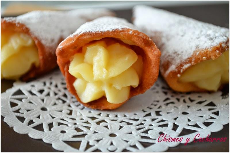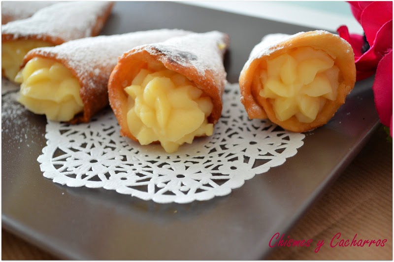 La masa se desprende del cono mientras se fríe en eso no da ningún problema. Dejar enfriar sobre papel de cocina y por último rellenar con la crema pastelera, yo la puse en una manga con boca rizada para que quedara más bonito.