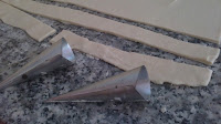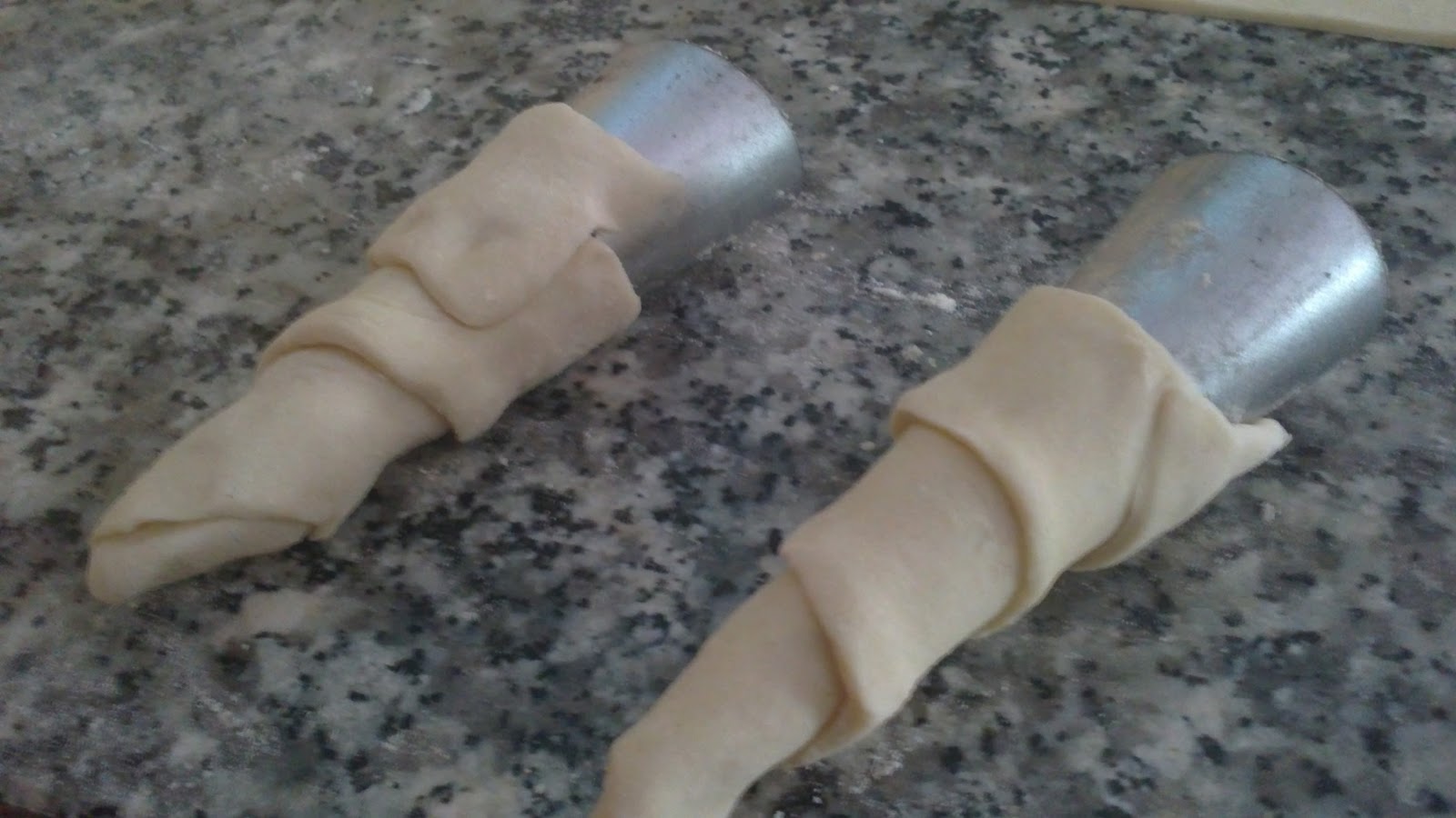 Corta tiras de hojaldre de unos 2 centimetros de ancho. Envuelve con ellas unos conos de metal, sella bien la union para que no se abra una vez horneado.
