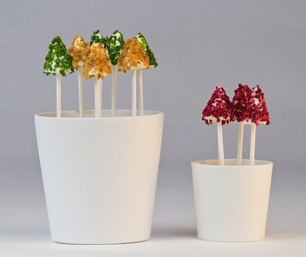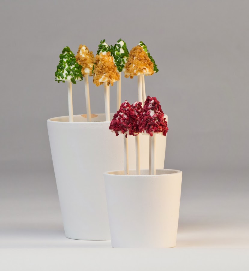 La presentación me encanta porque puedo distribuir las macetas de diferentes tamaños por la mesa principal y alguna otra auxiliar. Parecen chupa chups de queso de diferentes sabores y colores.