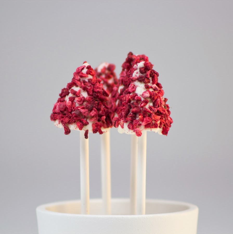 Quitar el la parte exterior del rulo de queso de cabra, colocarlo en un plato y mezclar la pimienta negra recién molida con un tenedor hasta encontrar el punto deseado. Colocar el queso en los moldes y procurar que la superficie quede bien igualada. Poner los palitos de papel blanco en la mitad de cada cono e introducir en el congelador.