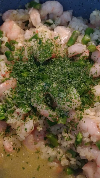 Añade el caldo que hayas preparado, azafrán, cúrcuma, pimentón... lo que hayas elegido y, si lo lleva, el perejil muy picadito u otras hierbas. Mueve una vez y comprueba el punto de sal. Rectifica si es necesario.