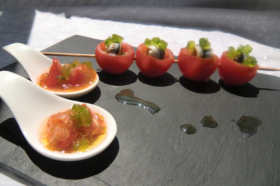 Una receta con truco incluido que son unos deliciosos Tomates cherrys con boquerones y gelatina de ajo y perejil.