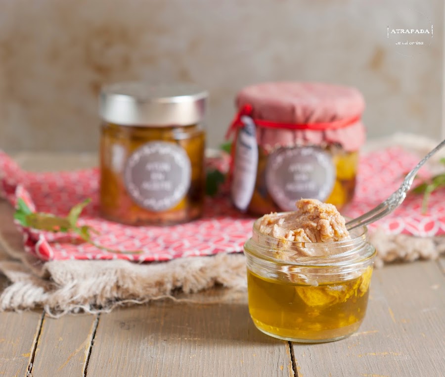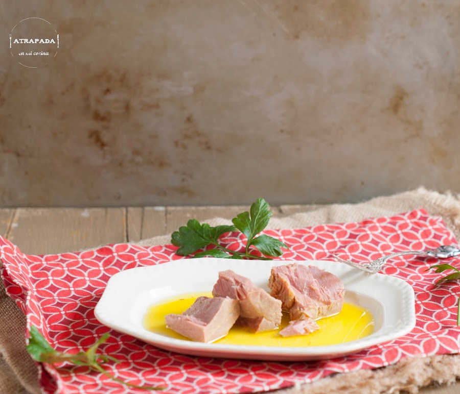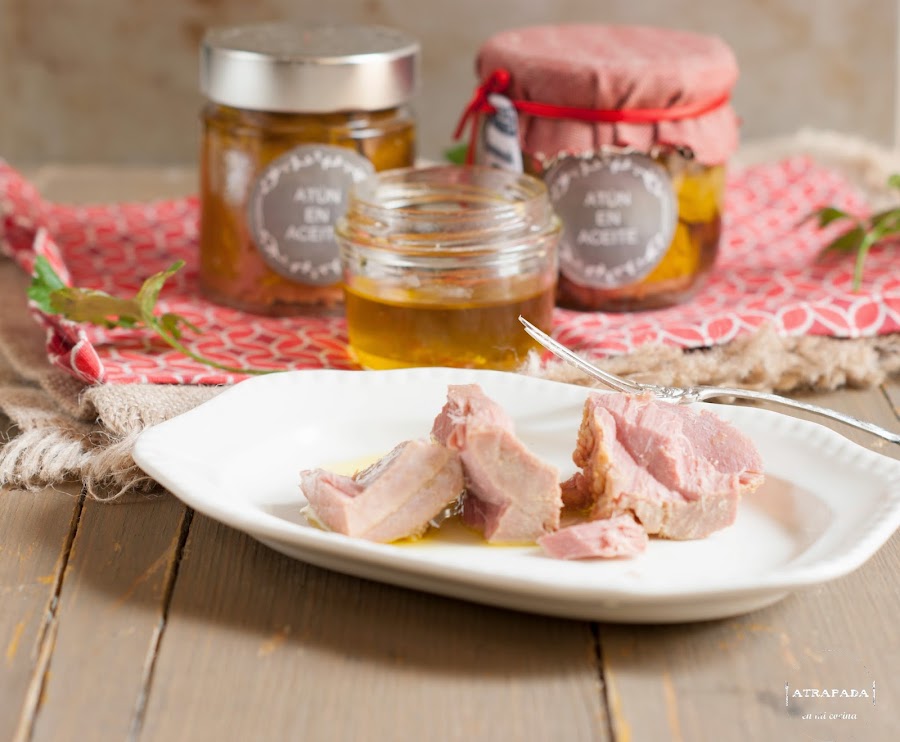 Quien guarda halla. Eso pensé la primera vez que hice conservas. A partir de entonces han sido muchos los botes de conservas que han ocupado mi despensa durante muchos años. Mermeladas, confituras, chutney, tomates secos en aceite, queso en aceite, bonito en aceite.....y una receta muy parecida a la del bonito, la que os traigo hoy. Este atún en conserva que preparé en verano y que ahora está listo para ser consumido. La receta se la vi a Chelo, de la que si seguimos todas sus recetas de conservas, encontraremos un buen manual para convertirnos en unos expertos en el tema de conservas. Cuantos más meses pasen desde su envasado aún será mejor. Yo he abierto el primer botecito a los tres meses, que es el tiempo mínimo que se aconseja tener en conserva. Algún otro bote lo regalé, y los que me quedan los voy a guardar para acompañar nuestras ensaladas de Navidad.