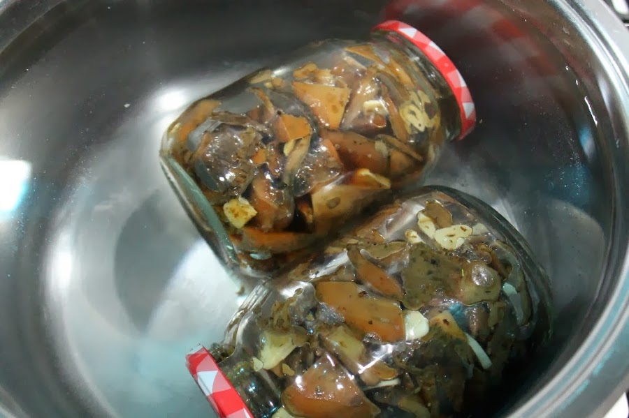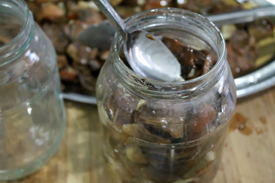 Una vez que tenemos los botes esterilizados y las setas cocinadas nos dispondremos a ponerlas dentro de los botes apretándolas bien pero sin aplastarlas, llenamos bien los botes y le ponemos el aceite que tenemos en la sartén, si no quedan cubiertas se rellena con aceite de oliva virgen el bote.