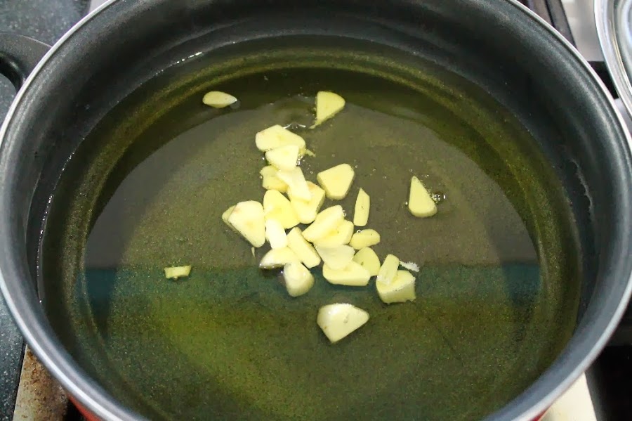 Pelar los ajos y cortarlos en láminas gruesas.